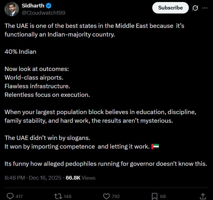 What’s also very interesting about the new wave of Indians online (on Western social media) is that it hasn’t caught on to girls in India yet. Most western social media users in India are predominately male (2/3rds on IG, probably more on twitter) and as a result most Indian sides of twitter are predominately Male focused (IE discussing sports, porn, foreign policy, and war/conflict). This has kind of developed two camps of indians you can meet online. The first are the elite human capital indians, such as the Siddarth guy above (who hosts a lot of spaces to discuss Indian American immigrants plans, I’d recommend listening if you’re free, its very funny) These guys have no qualms about subverting their host country and want to do everything in their power to ensure immigration visas/work visas stay or get expanded in America, saying stuff like, without Indian talent the American tech industry will fall apart. You can think of these people as the Indian liberals (not leftists, liberals) very similar to other groups of liberals in America. Even though they are liberals, they support Vivek. These are the Indian CEO’s, software engineers, middle class, and etc (theyre very fond of showing that graph that shows that indian immigrants to the us make more then most other groups). You get the idea. Then in growing numbers now, you have the Hindu nationalist groups, which think of them as Indian right wingers in terms of what they believe. They dislike Europe, especially the UK, don’t really enjoy Russia, dislike China, and above all, dislike Pakistan and the rest of the Muslim world. Historically they have liked America quite a bit, but ever since the whole christmas vivek thing they have been quite enraged at america, especially white people. (Mostly the internet rw is responsible for that, not that its important) They were shocked to learn that white people actually didn’t like them at all and viewed them as disgusting (before this most of them assumed indian hate online was a product of muslims) And above all, and this is the important thing, these people try to defend Indias “PR” online. One of them wised up and realized that a lot more people in the globe hate america (including americans!) then are americans and view posts hating on Americans and especially white people (They also hate on Korea and Japan as well, as well as Ukraine and Argentina) that do very well in the numbers as helping Indias PR globally. Unlike the former group who speak actually pretty impressive english all things considered, these people are the common indians and speak very broken english, and their posts are very nonsensical and make zero sense. A good example just look up the account Desi King and look for any of his hate posts on americans/white people in between the usual engagement bait and hate on Muslims